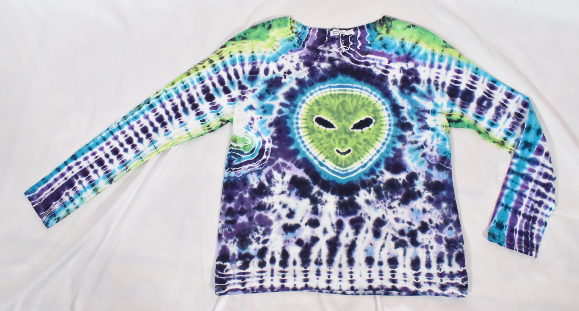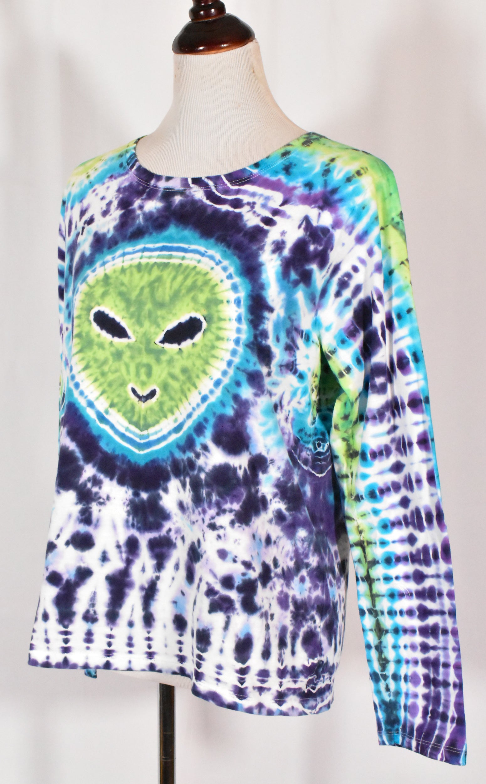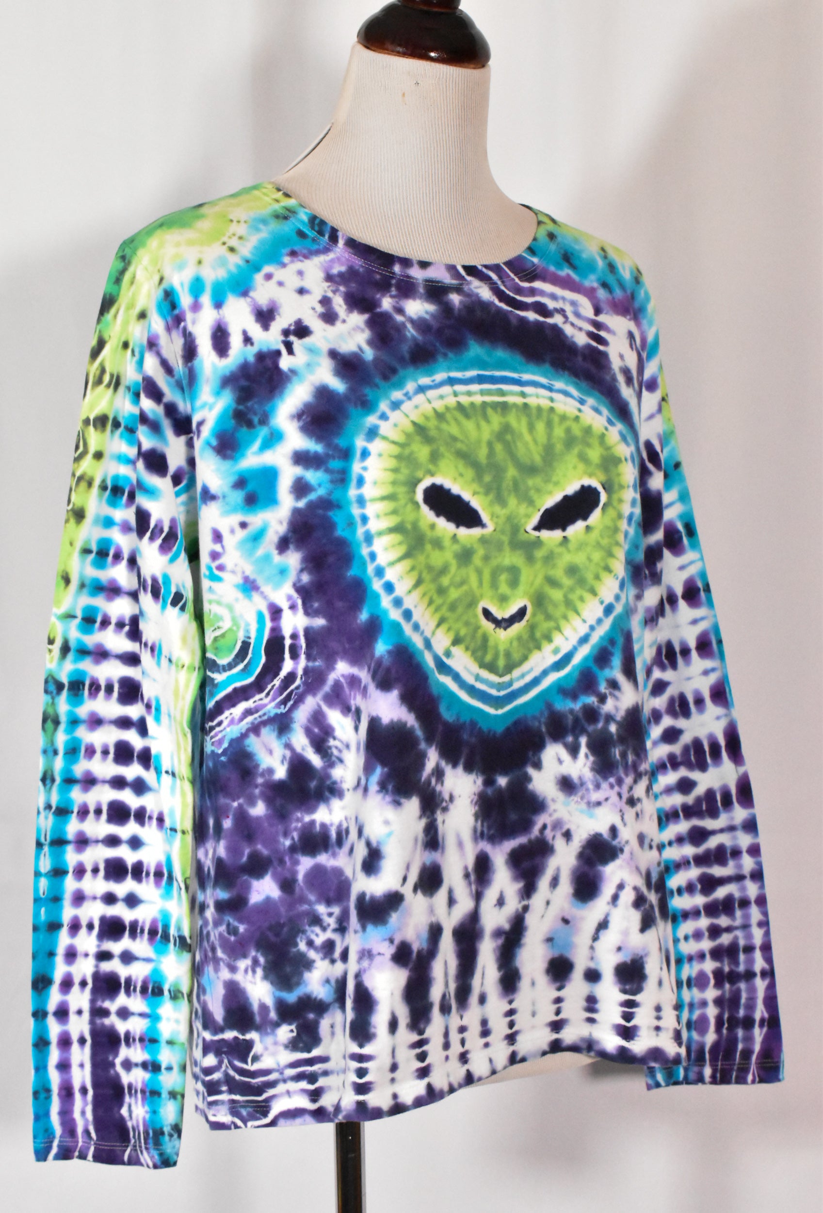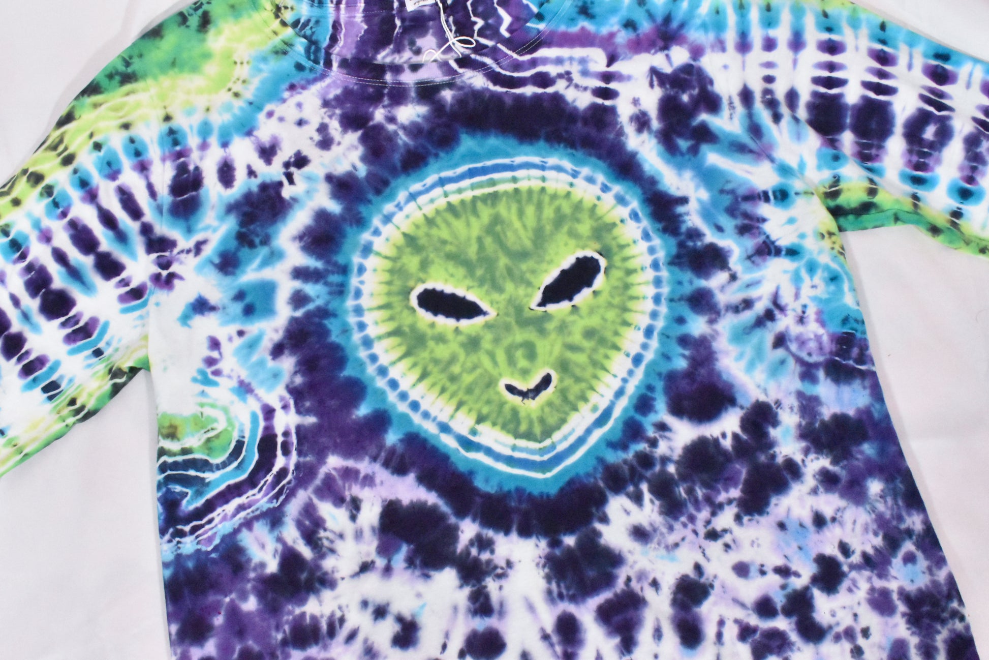 -Looking to take a trip to the cosmos? This alien UFO shirt is out of this world! Tie dye designs in greens, blues, and purples. Beam me UP!!